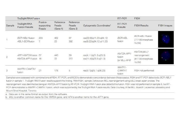 TruSight RNA Fusion Panel은 혈액, 골수 또는 FFPE 샘플을 사용하여 다수의 암 유형에서 507개의 유전자 융합 관련 유전자에 대해 알려져 있는 파트너 및 새로운 파트너와의 유전자 융합 검출 연구를 지원합니다.