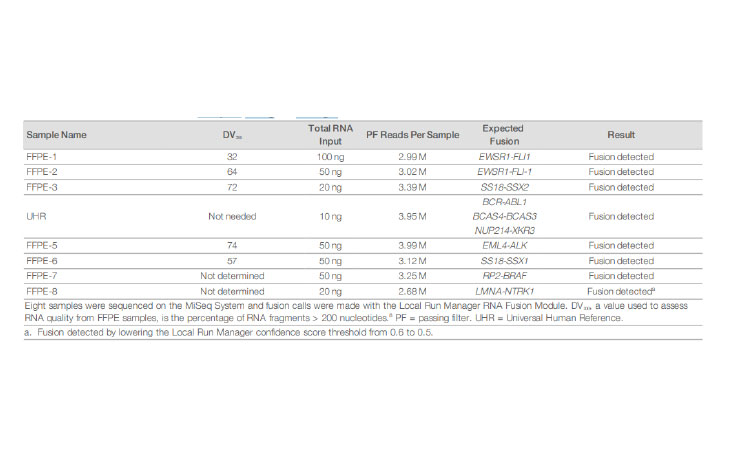 Trusight RNA Fusion Panel은 고품질 및 저품질 RNA 샘플의 종류 모두에서 고성능을 얻을 수 있도록 최적화되어 있습니다. 라이브러리 준비에는 최소 10 ng의 Total RNA 또는 20 ng의 FFPE RNA가 필요합니다. 이러한 저사용량 요건 덕분에 이 패널은 제한된 수량의 샘플에 대한 안정적인 표적 분석에 적합합니다.