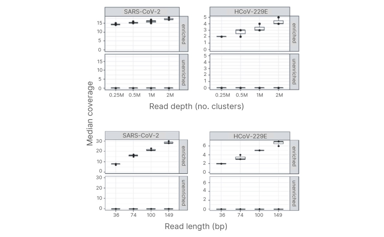 Pan-Coronavirus 패널로 인리치먼트 후 10 ng UHR에서 합성 바이러스 RNA 대조군(SARS-CoV-2 및 HCoV229E)의 커버리지 중앙값. 리드 뎁스(상단) 및 리드 길이(하단)가 증가하여 게놈 커버리지가 개선되었습니다. 리드 길이를 36, 74, 100 및 149 bp로 트리밍했습니다.