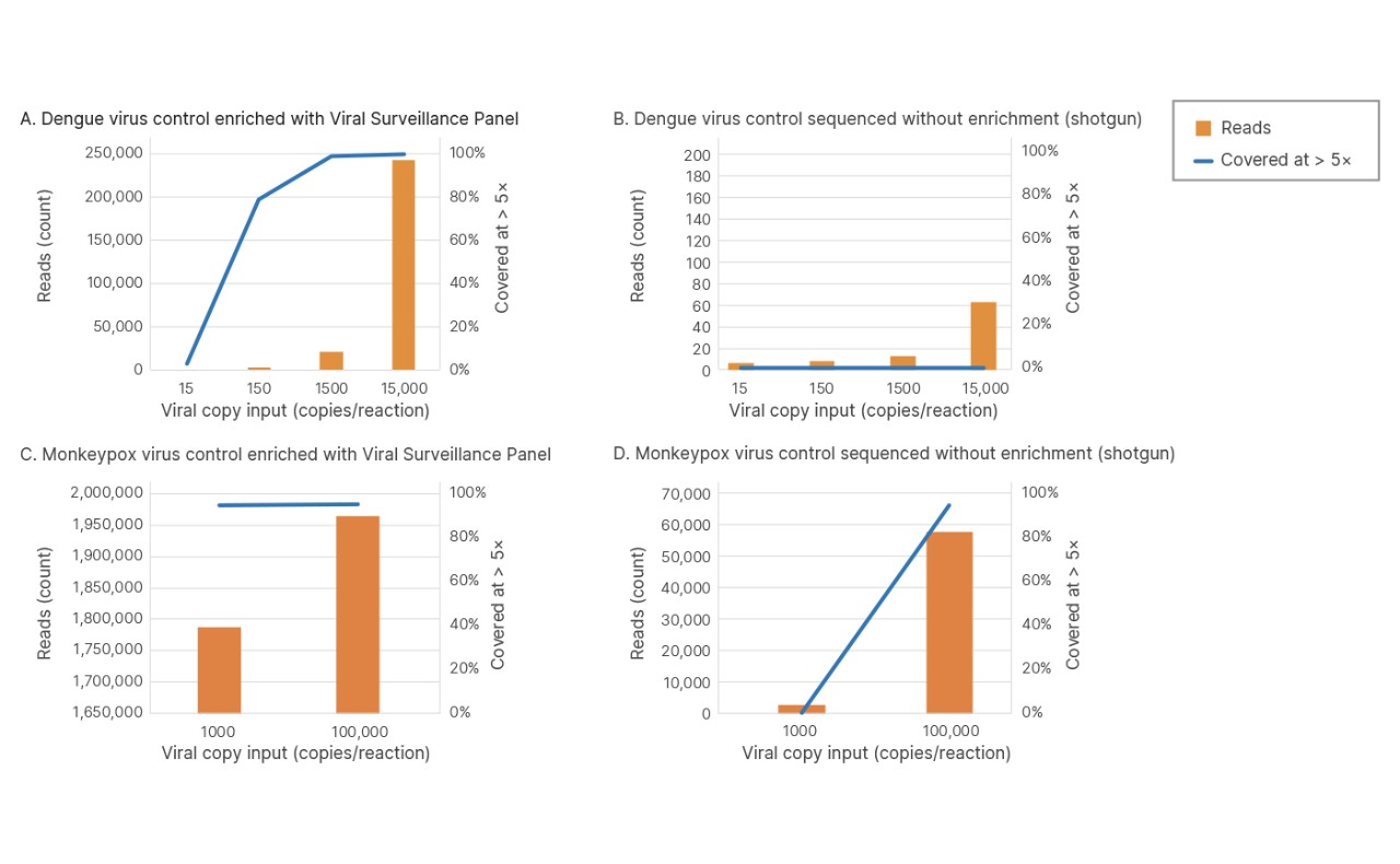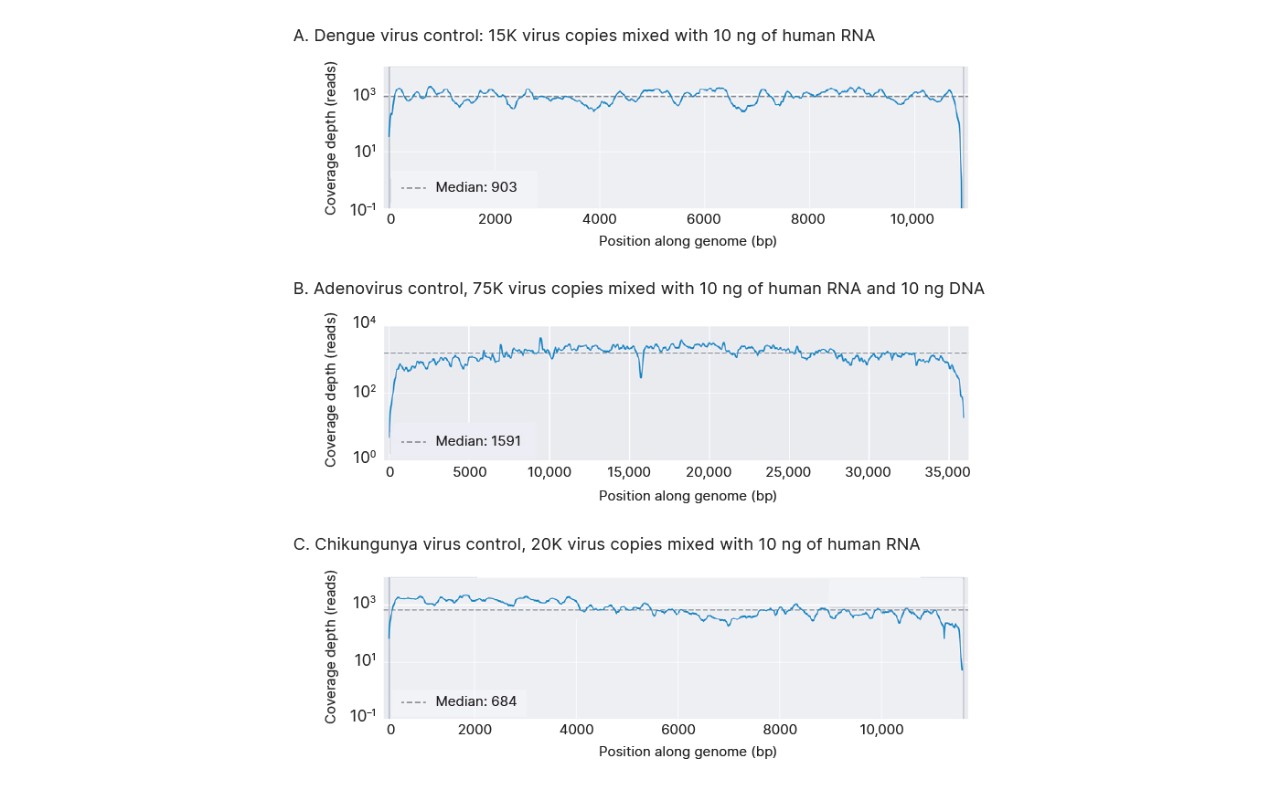 Viral Surveillance Panel v2 키트의 표적 인리치먼트 프로브는 전체 바이러스 유전체에 대한 균일한 커버리지를 제공합니다. 바이러스 대조군은 알려진 복제수의 바이러스 대조군을 10 ng 인간 RNA/DNA 혼합물과 혼합하여 제조했습니다. 라이브러리는 Viral Surveillance Panel v2 키트 워크플로우에 따라 준비되고 시퀀싱되었습니다.