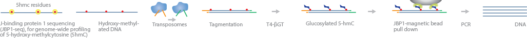 J-binding protein sequencing (JBP1-seq) method relies on the strong affinity the J-binding protein 1 (JBP1) has for 5-ghmC. A recombinant JBP1 protein with an additional His tag and Avi tag was biotinylated in vivo. After protein purification, the biotinylated JBP1 was conjugated to streptavidin-coated magnetic beads.