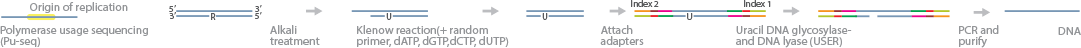Pu-seq provides direct replication-origin location and efficiency data, as well as indirect estimates of replication timing. Alkali treatment of duplex ribonucleotide-containing DNA results in phosphate-backbone cleavage 3’ to the ribose, resulting in a 5’-hydroxyl end. If the denatured DNA is used as a template for random-hexamer primer extension, 5’ to 3’ synthesis results in a flush end adjacent to the initial ribose. By generating a library from single-stranded DNA and placing distinct index primers at each end, sequencing reads can be mapped to individual strands, to determine the original ribonucleotide position with single-base accuracy.
