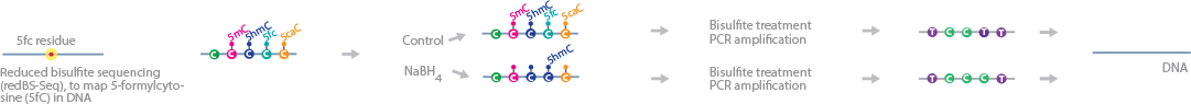 redBS-Seq relies on the chemical reduction of f5C to hm5C by NaBH4. The hm5C is then detected in the same manner as m5C. In MAB-seq, 5fC is first reduced by NaBH4 to 5hmC. Owing to the combination of NaBH4 reduction with M.SssI treatment, 5caC is sequenced as T after bisulfite conversion, whereas C, 5mC, 5hmC and 5fC are read as C.