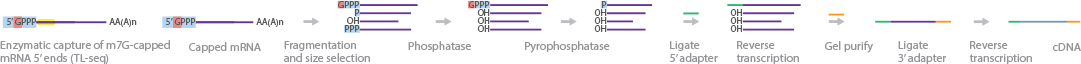 TL-Seq targets and enriches for the sequence around the 5'-UTRs of 5'-capped mRNA molecules before sequencing. Poly(A)+ RNA is fragmented and selected for 50–80 nt fragments. RNA fragments with phosphorylated 5' ends are dephosphorylated, using calf intestinal phosphatase (CIP), to distinguish them from capped mRNA fragments. Next, TAP strips the capped mRNAs and exposes the phosphate on the 5' end for P5 adapter ligation. The adapter-ligated fragments are gel-purified by molecular weight before ligation of P7 adapters. The 3'-end adapters can be attached by poly(A) tailing and ligation, or directly if using preadenylated adapters. After RT and PCR amplification, the RNA library is sequenced.