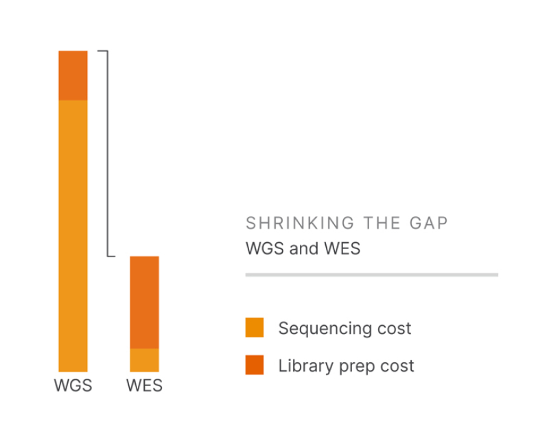 NovaSeq X 시리즈의 Gb당 비용 감소는 NovaSeq 6000 시스템과 비교하여 WGS와 전장 엑솜 시퀀싱(WES) 간의 갭을 2.5배 이상 줄입니다. (250억 개 300 사이클 키트의 미국 가격 기준).