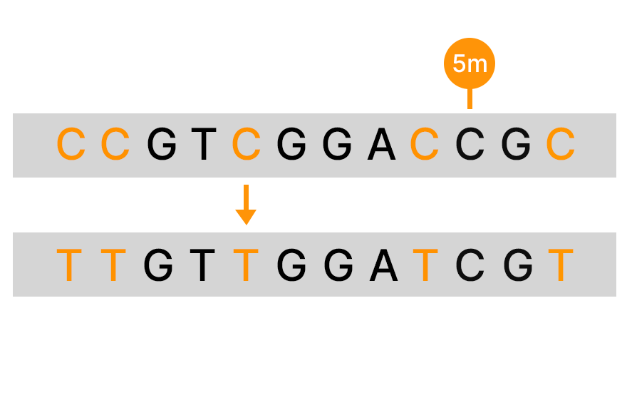 • 시토신이 티민으로 전환되는 단일 염기 다형성(SNP)은 바이설파이트 전환 시 누락됩니다.