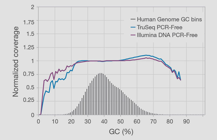 The Illumina DNA PCR-Free Prep provides uniform coverage across a range of GC content in the human genome.