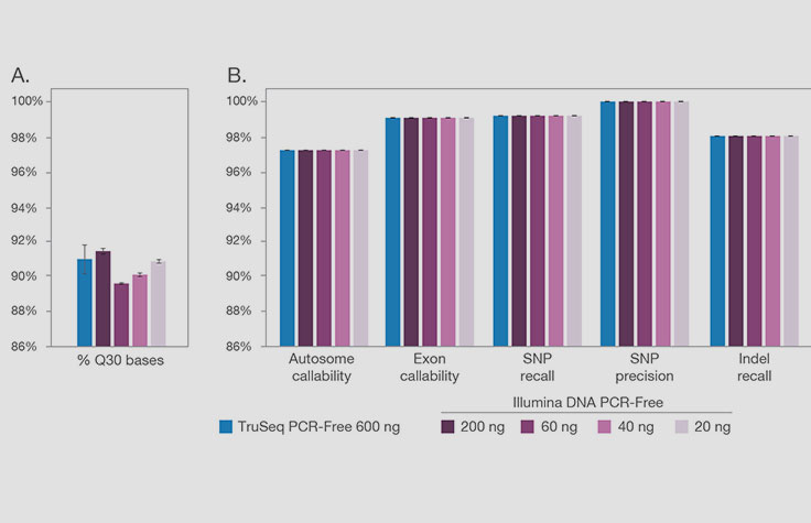Illumina DNA PCR-Free Prep libraries prepared from a range of DNA inputs demonstrate (A) passing quality specifications for all DNA inputs and (B) equivalent callability performance.