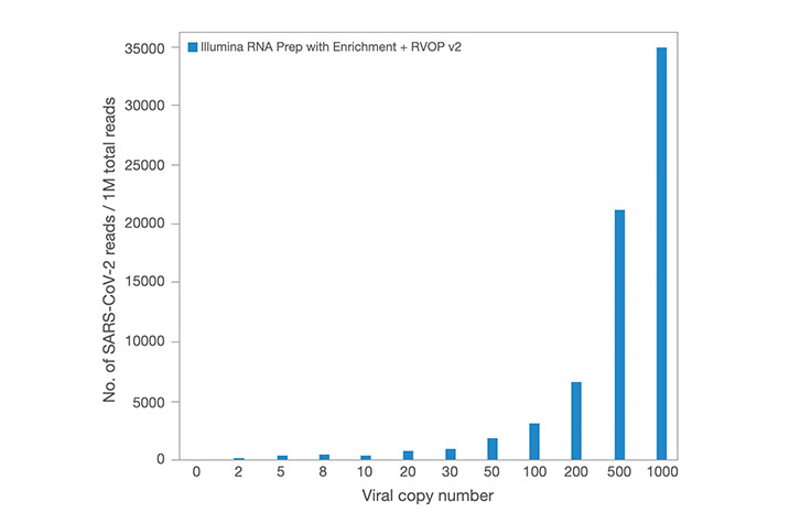 In a titration experiment of human saliva RNA spiked with a defined amount of virus copies, the Illumina Respiratory Virus Enrichment Kit resulted in detection of viral reads from as low as two copies of SARS-CoV-2 viral RNA.