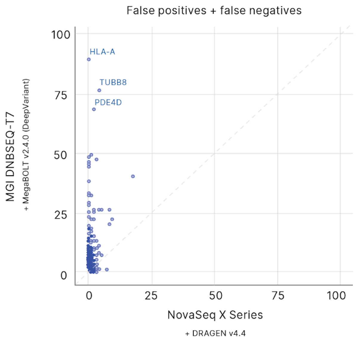 The NovaSeq X Series demonstrates the commitment of Illumina to innovate next-generation sequencing (NGS) capabilities and build future methods.[1] Capable of data-intensive applications at production scale, the NovaSeq X Series empowers scientists to make new discoveries. In 2019, Complete Genomics/MGI launched the production-scale DNBSEQ-T7 sequencing platform, including claims that it is capable of sequencing 60 whole human genomes in one day with “exceptionally high accuracy”.[2] Indeed, several independent studies have reported comparable levels of sequencing quality and coverage between the DNBSEQ-T7 sequencing platform and the NovaSeq 6000 System, the predecessor to the NovaSeq X Series.[3][4] To evaluate performance and accuracy claims, Illumina conducted a comparative analysis of WGS using the NovaSeq X Series with DRAGEN v4.4 secondary analysis (the Illumina WGS solution) and the Complete Genomics/MGI DNBSEQ-T7 sequencing platform with MegaBOLT v2.4.0 bioinformatics pipeline (the MGI WGS solution). The results of this evaluation demonstrate that the Illumina WGS solution delivers more accurate variant calling, provides more comprehensive coverage in challenging regions of the genome, and enables more insights into the molecular mechanisms of disease than the MGi WGS solution.