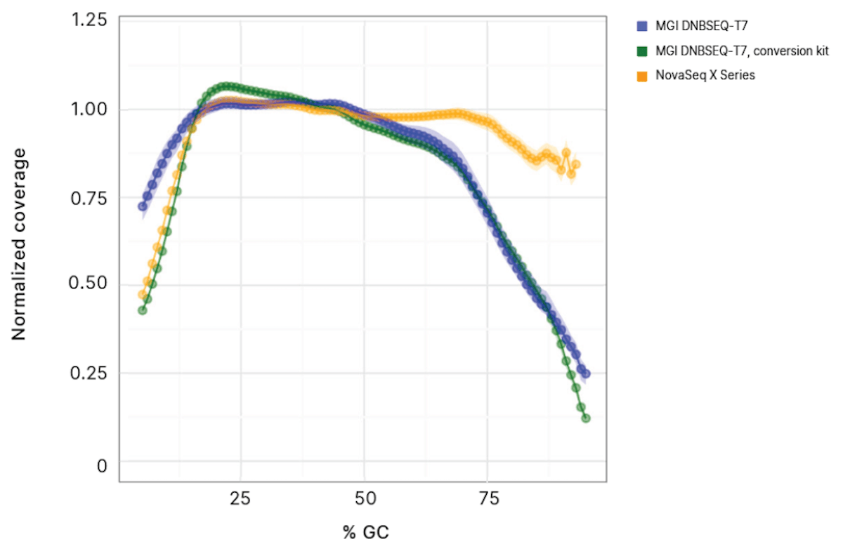 Figure 3: Loss of coverage in GC-rich regions with the MGI WGS solution─WGS of MGI native libraries and converted TruSeq DNA PCR-Free libraries on the DNBSEQ-T7 solution resulted in loss of coverage in repetitive, GC-rich regions of the genome, compared to WGS on the NovaSeq X Series. Normalized coverage is plotted to ensure data is comparable across samples or conditions and is calculated by dividing the read depth at a specific position by the mean coverage of the genome.