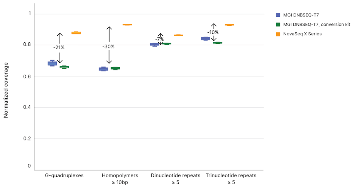 Figure 4: Loss of coverage in challenging regions with the DNBSEQ-T7 solution─WGS of MGI native libraries and converted TruSeq DNA PCR-Free libraries on the DNBSEQ-T7 solution showed significant reduction in coverage in regions challenging to sequence compared to the NovaSeq X Series.