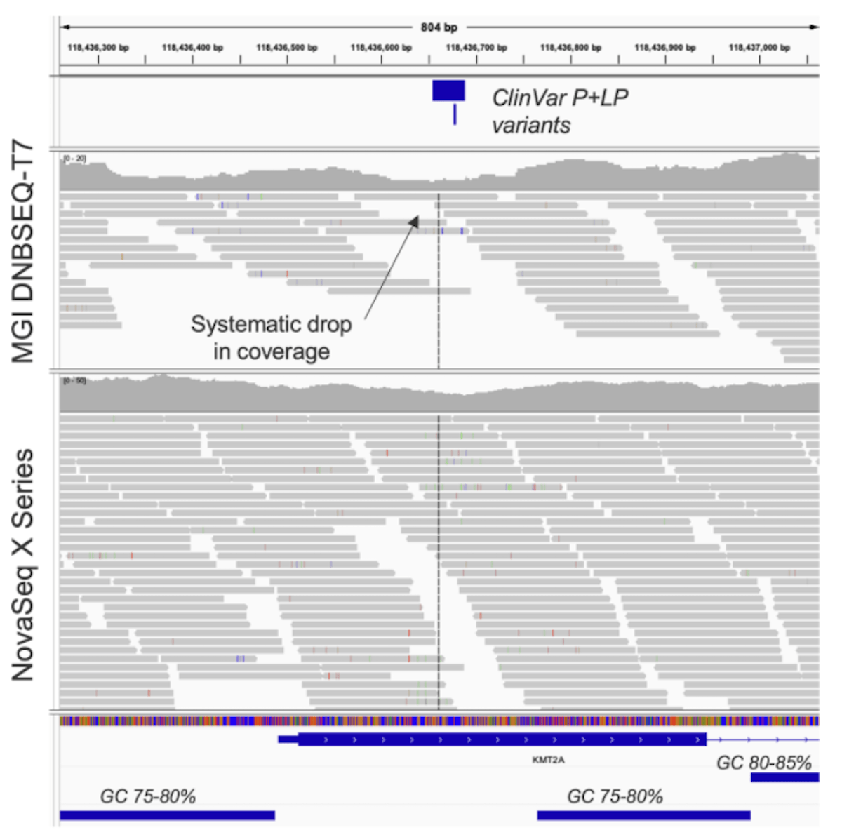 Figure 5: Loss of coverage in the KMT2A gene with the MGI WGS solution─Sequencing of MGI native libraries with the DNBSEQ-T7 platform resulted in loss of coverage in disease-relevant genes with high GC content, such as the KMT2A gene, compared to WGS on the NovaSeq X Series.