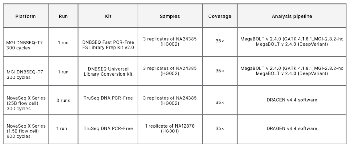 MGI DNBSEQ-T7 sequencer with MegaBOLT bioinformatics analysis vs Illumina NovaSeq X Series with DRAGEN secondary analysis.